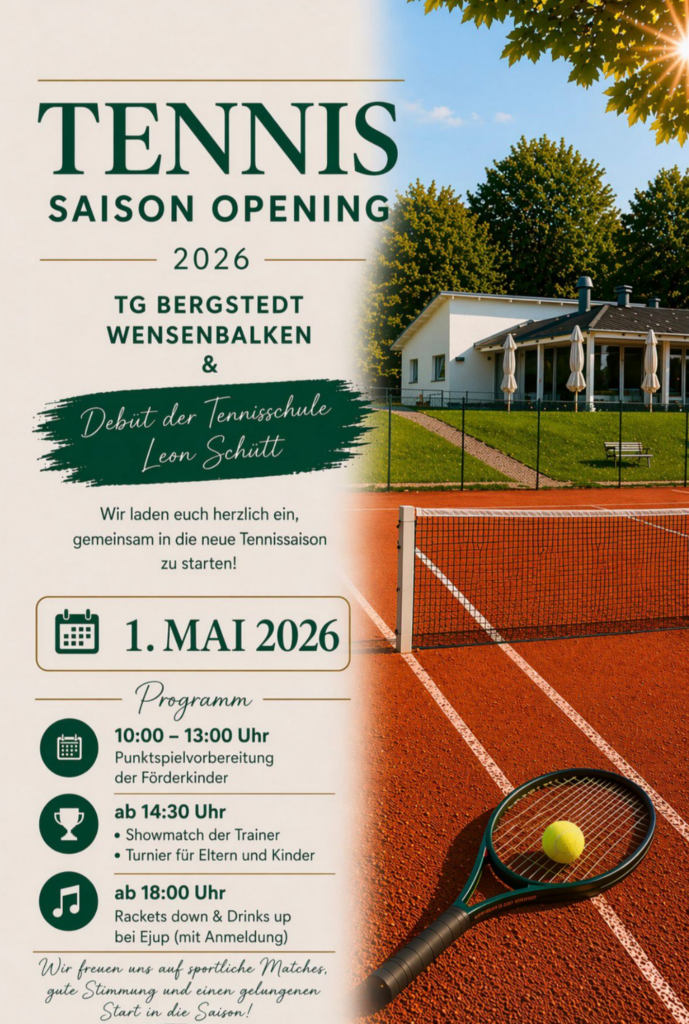 endlich ist es wieder soweit: Am 01. Mai 2026 eröffnen wir gemeinsam die neue Tennissaison beim TG Bergstedt-Wensenbalken – und das wollen wir natürlich gebührend feiern! 🌞